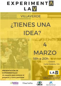 Vente si quieres entender qué es un laboratorio ciudadano, para saber si las ideas que tienes pueden presentarse a la convocatoria, para conocer Cinesia, un centro vecinal de innovación, para descubrir de dónde sale el nombre de ExperimentaLAV, para conocer algunos proyectos que ya han participado en un laboratorio, para explorar cómo una convocatoria como esta podría impulsar tu idea o a tu colectivo, para investigar qué cosas se están haciendo ya en Villaverde, para conocer a otras personas que se interesan por los mismos temas que tú, para pasar una tarde agradable,